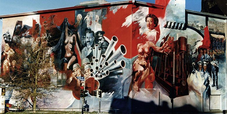 Bild: „Revolution und Krieg“, Shahin Charmi, 1989, Wandmalerei am Iltisbunker, Kiel. Foto: Gaardian. Veröffentlicht unter CC 4.0. bei wikimedia commons.