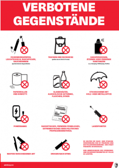 Alkoholfreie Getränke dürfen in Tetrapacks bis 0,5 Liter mit ins Stadion genommen werden. An den Cateringsständen ist nur Barzahlung möglich. Eine Liste verbotener Gegenstände seht ihr unten, falls das schlecht lesbar ist: Taschen und Rucksäcke sind nur bis zum Format A3 erlaubt.